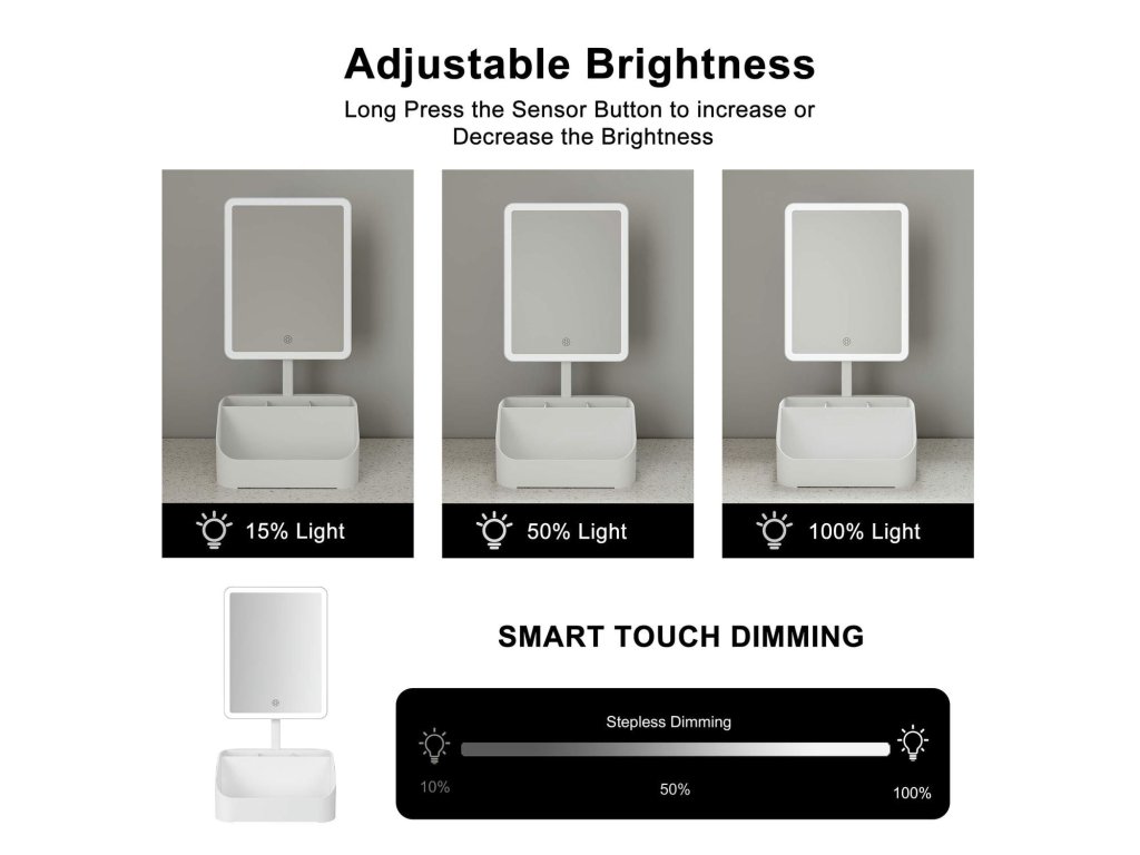 Vestavěné LED diody se postarají o ideální podmínky, vy se tak můžete plně věnovat jen sobě a přípravě – ať už se chystáte na běžný den, večírek nebo slavnostní událost. Jedním dotykem si přizpůsobíte jas a barvu světla 84 vestavěných LED diod. Na výběr je osvícení od jemného teplého, přes neutrální až po jasně studené. Každý pohled do zrcadla vám tak dodá jistotu, že vypadáte skvěle.