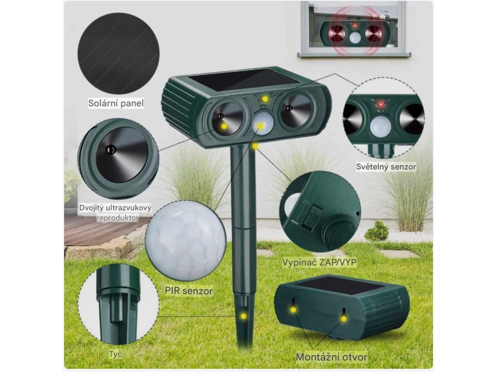 Díky vodotěsnému a odolnému provedení je zařízení vhodné pro venkovní použití za jakéhokoli počasí. Můžete jej snadno umístit na plot, zeď nebo zapíchnout přímo do země. Vestavěný infračervený PIR senzor pohybu dokáže zachytit zvířata v úhlu 110° a dosahu až 10 metrů, přičemž spustí ultrazvukový signál, který zvířata spolehlivě odradí. Instalace je jednoduchá a intuitivní, stačí zařízení umístit na vhodné místo a nabít solárním panelem před prvním použitím.