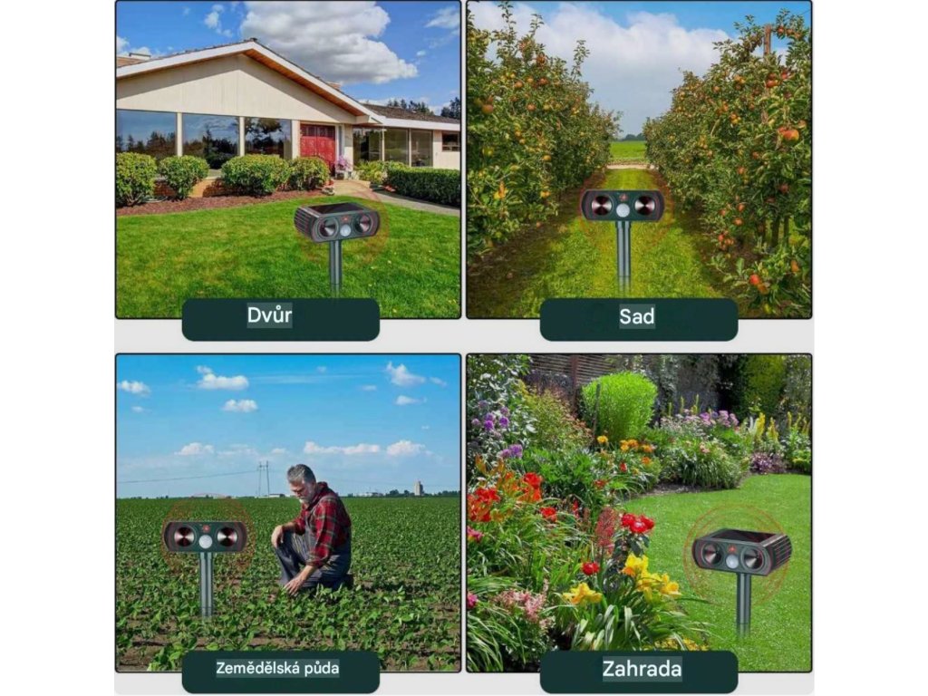 Solární napájení přináší ekologické a praktické řešení – odpuzovač se nabíjí přímo ze sluneční energie, což šetří baterie a přispívá k ochraně životního prostředí. Kvalitní materiály, UV ochrana a odolnost proti stříkající vodě zaručují dlouhou životnost i při dešti, sněhu nebo ostrém slunci. To činí zařízení vhodným pro zahrady, dvory, farmy a veřejné prostory, kde je třeba zamezit pohybu nežádoucích zvířat.