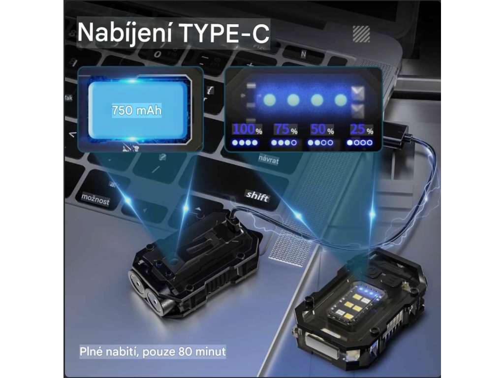 | Nabíjení: | USB C kabelem (součástí balení) |