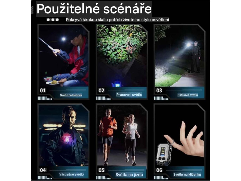 Velkou výhodou je integrovaný klip na kšilt nebo oblečení, díky kterému můžete mít světlo přímo před sebou a mít obě ruce volné. Zadní magnet umožňuje přichycení na kovové povrchy, například při opravách, v dílně nebo u auta. Díky kombinaci klipu, magnetu a kroužku na klíče se z této mini svítilny stává univerzální pomocník, který se snadno přizpůsobí jakékoli situaci.