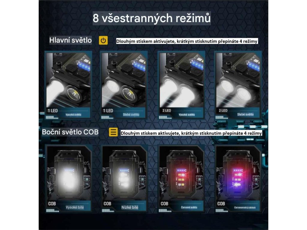 | 8 režimy svícení: | 4 pro diody a 4 pro COB |