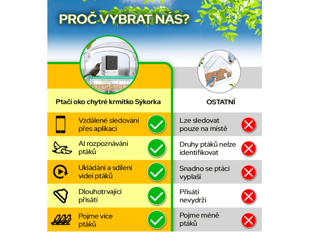 Pozorujte ptáky z úplné blízkosti, aniž byste je rušili. Ptačí oko – chytré krmítko Sýkorka se připevní přímo na okno a promění vaše sklo v živou ptačí pozorovatelnu. Z pohodlí obýváku nebo pracovny uvidíte každou návštěvu, pořídíte videa i fotky a vše můžete sledovat v reálném čase v telefonu.