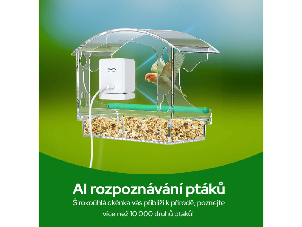 Integrovaná 3MP FULL HD kamera s vysokým rozlišením zachytí detaily peří i typické znaky jednotlivých druhů. PIR senzor pohybu s úhlem detekce 110° přesně sleduje prostor u krmítka a spustí záznam ve chvíli, kdy pták přiletí. Umělá inteligence (AI) dokáže rozpoznat 10 000+ druhů ptáků, takže vždy víte, kdo vás navštívil.