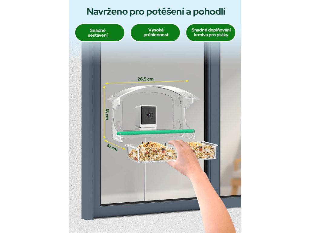 Ptačí oko – Sýkorka je vyrobené z čirého plastu, takže vám ani ptákům nebrání ve výhledu. Přísavky se silným přítlakem ho bezpečně udrží na okenní tabuli, ať už ho umístíte v přízemí nebo ve vyšším patře. Otevřená konstrukce poskytuje ptákům pohodlný přístup ke krmivu, zatímco vy máte dění přímo „před nosem“.