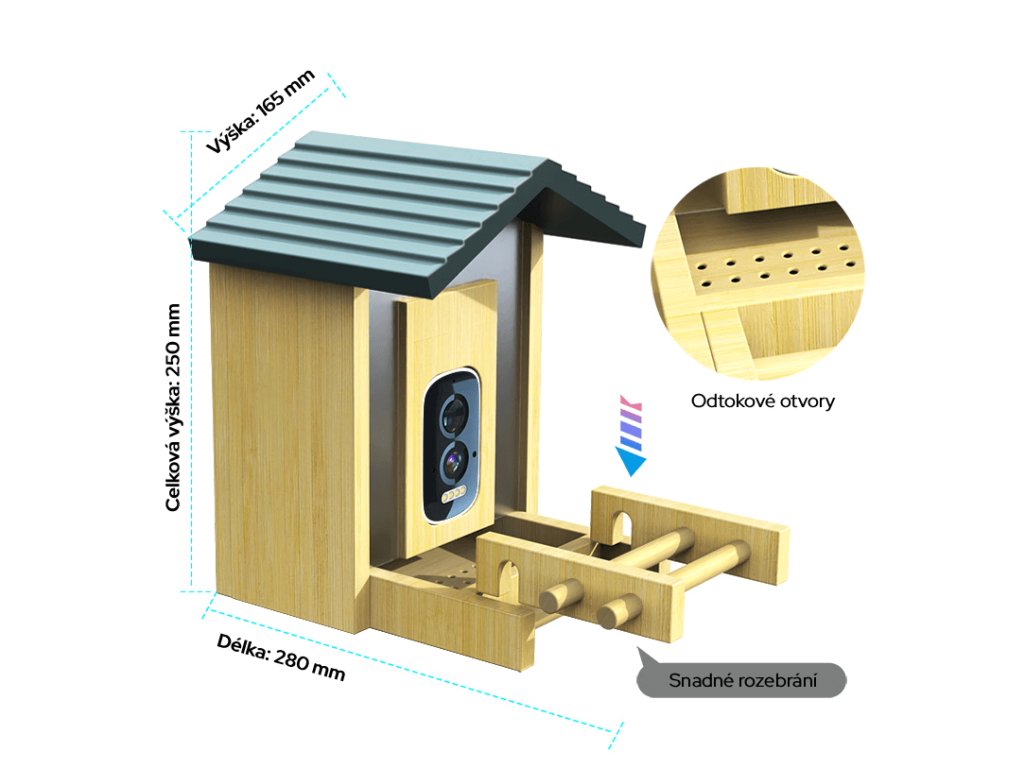 Ptačí oko – Sojka bonzačka je vyrobené z dřevitého/bambusového materiálu, takže působí přirozeně a stylově mezi stromy, keři i na terase. Domečkový design vytváří ptákům bezpečné a pohodlné místo ke krmení a zároveň elegantně doplní vzhled vašeho exteriéru.